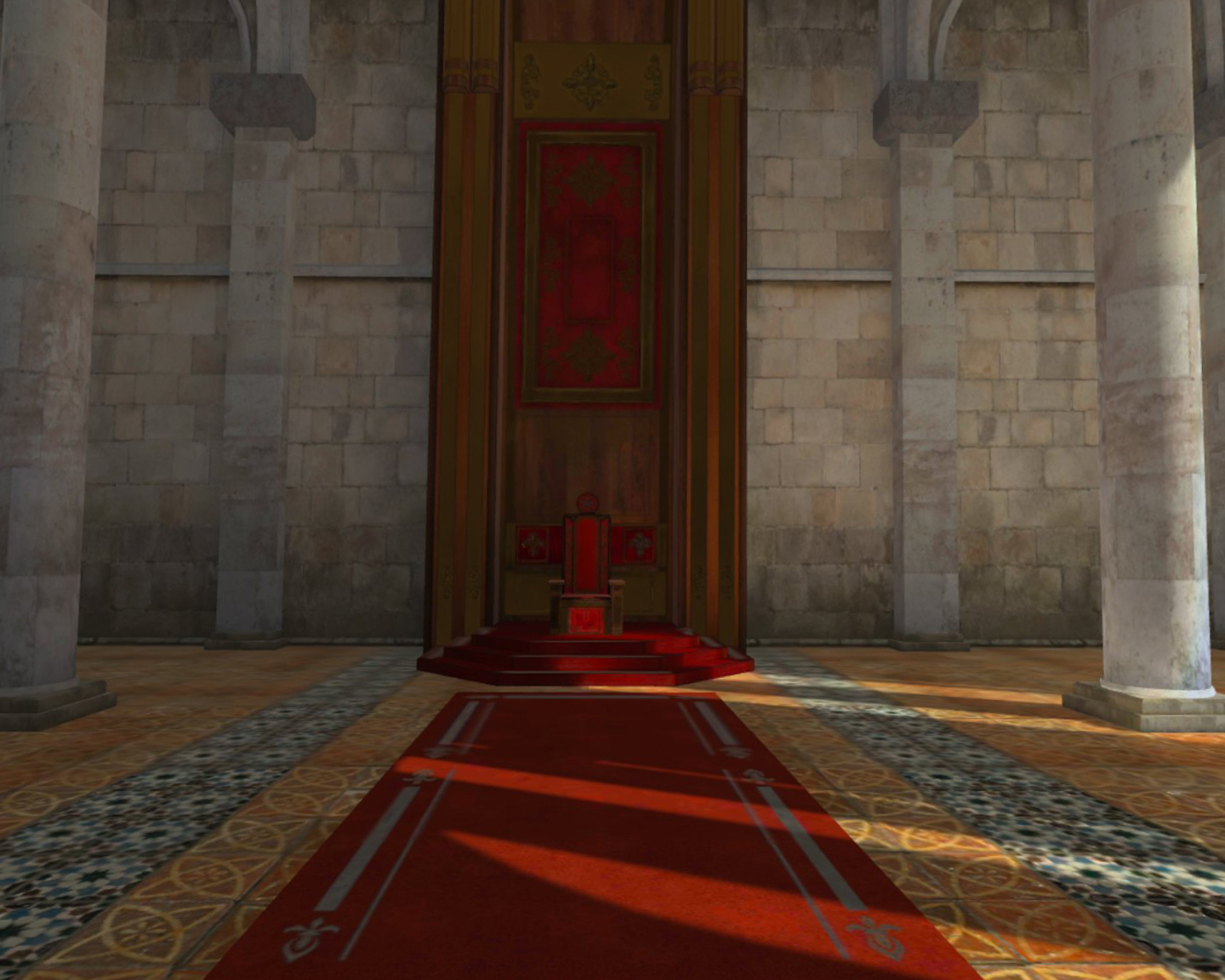 We find ourselves in an elongated rectangular space with high ceilings that recalls the appearance of the central nave of a Gothic cathedral. The space is divided into two lateral corridors and a larger central space by two rows of simple columns, which support cross vaults. The entire supporting structure is in stone, while the floor is covered with glazed terracotta tiles and decorated with ecclesiastical motifs. Along the side walls we find several Gothic windows with wooden frames and stained glass decorations, some of which are opened and let the sunlight in. The visible exterior consists only of a blue sky and a full sun. Along the central corridor there is a red carpet that leads us to a raised platform on which a throne rests, behind which there is a decoration that reflects the proportions of the carpet. The throne area is mainly made up of wood, red fabric and brass. On the opposite wall there is a wooden and metal door, closed.