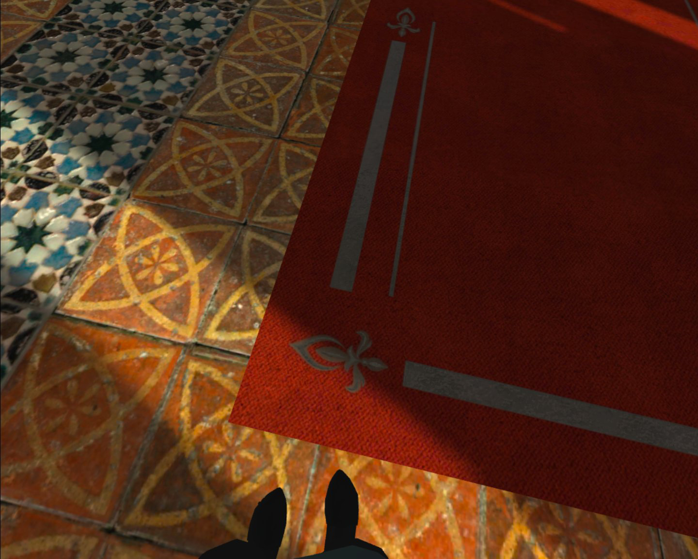 This space is incredibly false and unpleasant: as soon as we enter our brain immediately perceives something unnatural and strange, not only given by the low definition of the textures and the too approximative geometry, but also by the light that does not reflect a plausible situation. Spending more time in this room, we perceive more and more the imprecision and the lack of elements of the real world: near the open windows we need to perceive the air entering, as well as the sensation of heat emanating from the sun's rays. Unless we are physically in a cathedral, our brain aware us that something is wrong: the sound does not propagate correctly respect to the visible space and we cannot hear our footsteps on the tiles or on the carpet. It also lacks the unmistakable smell that places similar to this have and the sensation of humidity emanating from the stone. All these elements lead to perceiving the space in an uncomfortable and controversial way, as if we were trapped in an old videogame.