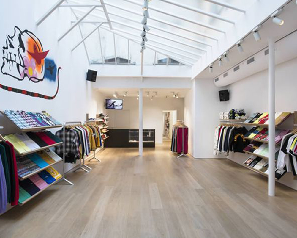 space almost completely white to neutralize the architecture elements in order to let the products stand out